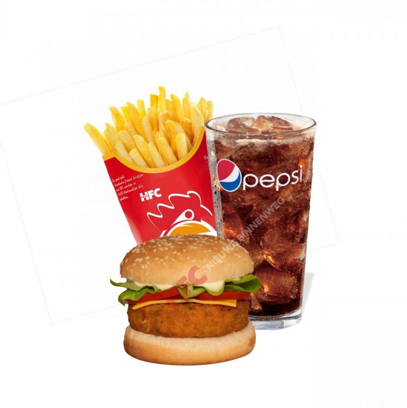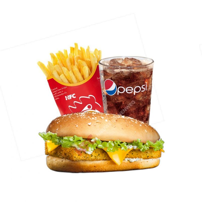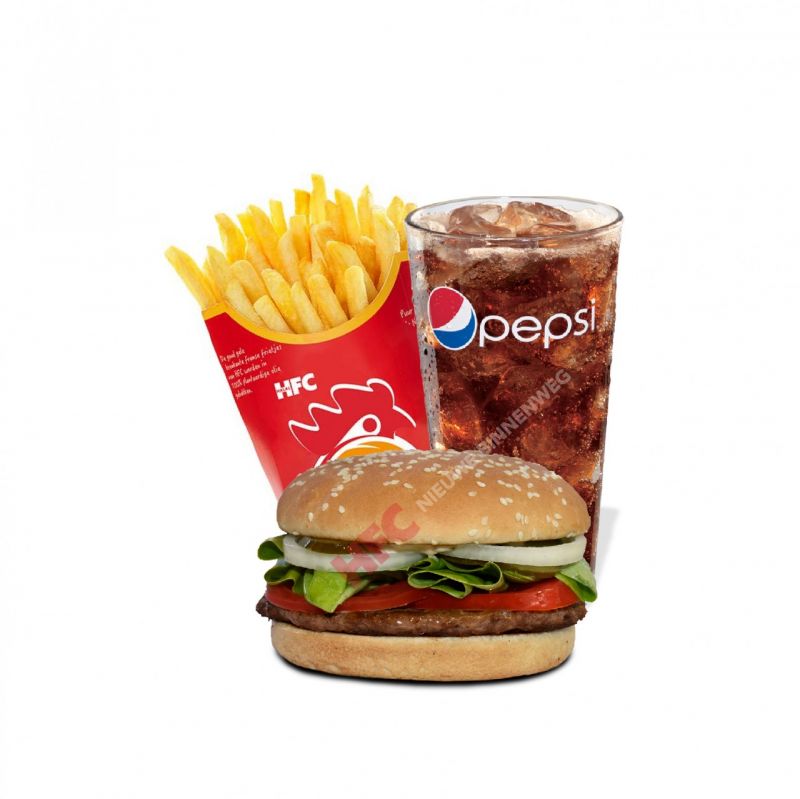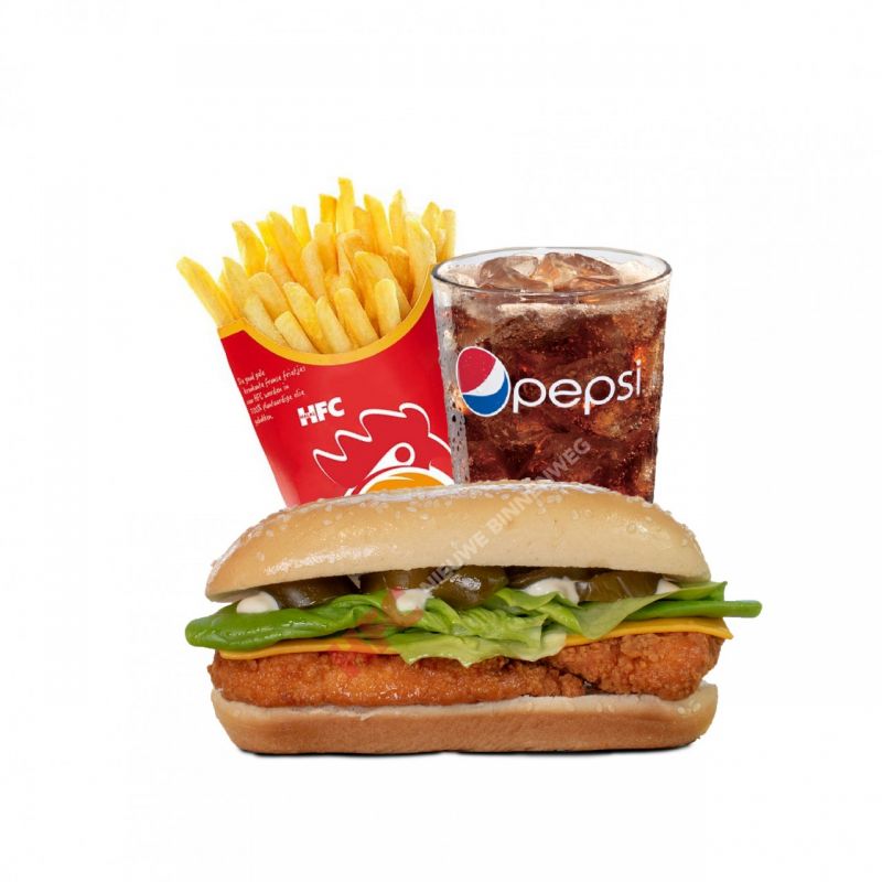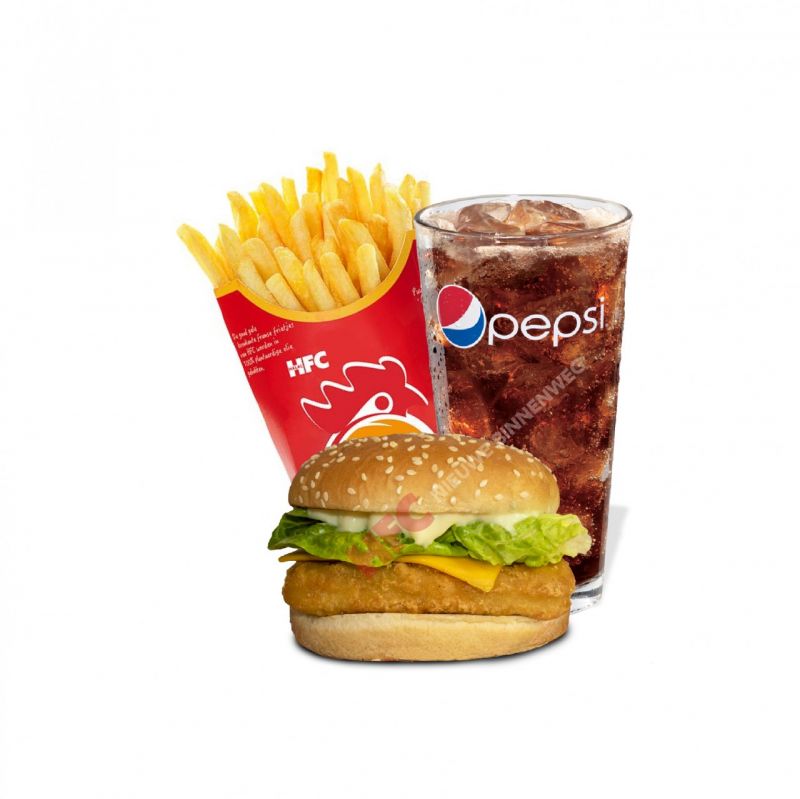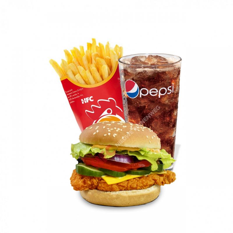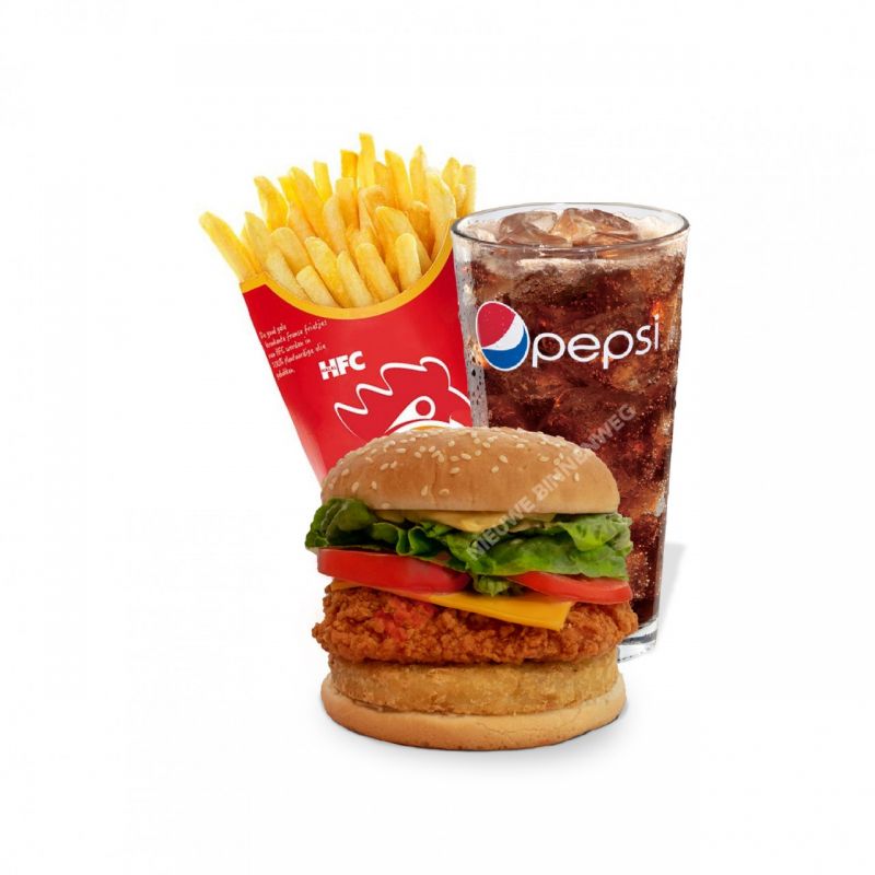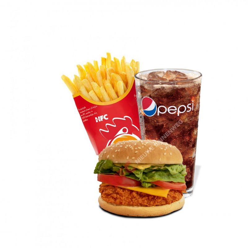 Spicy Chicken Burger of Cheeseburger, 1 kipstuk, 3 hotwings en 2 tenders. Geserveerd met frietjes ...