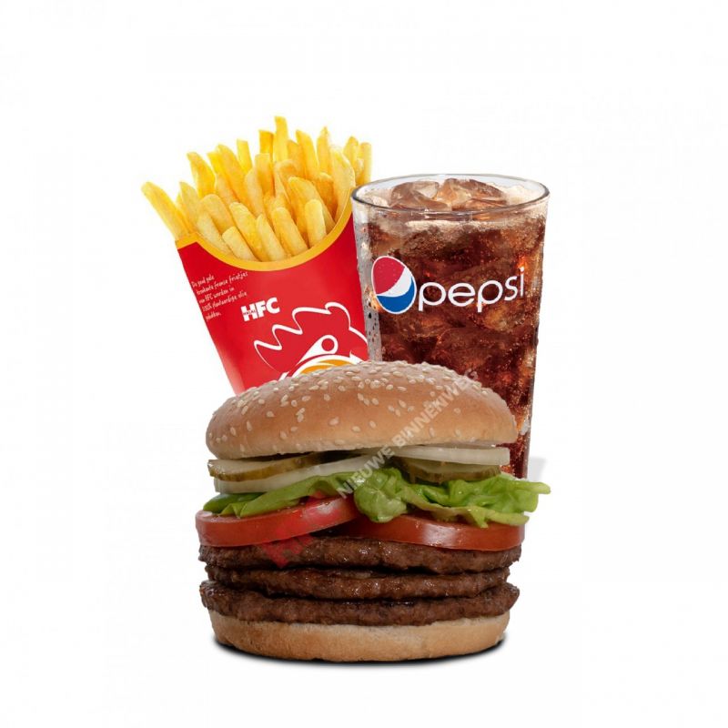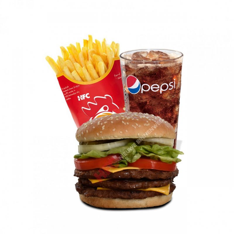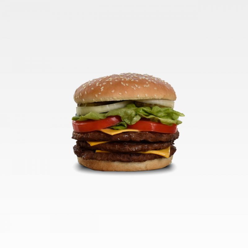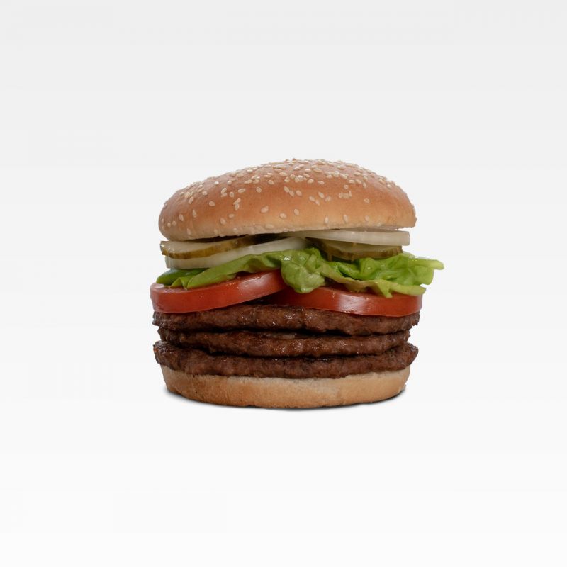 Een wit sesambroodje met triple rundvlees, verse uitjes, augurken, frisse ijsbergsla, verse tomaat en onze ...