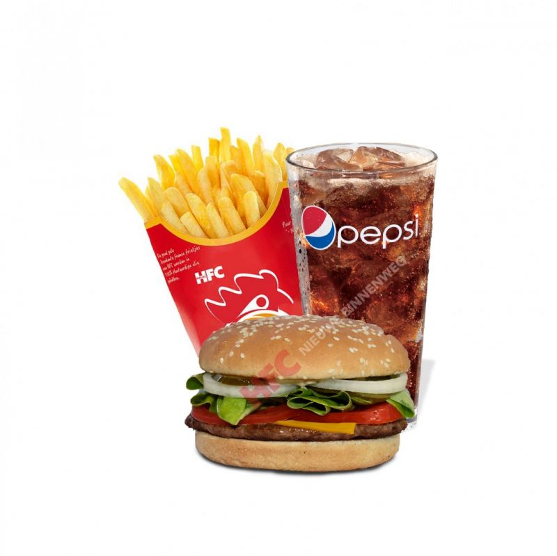 1 small beef burger + small friet + frisdrank naar keuze. Plus een speelgoed.