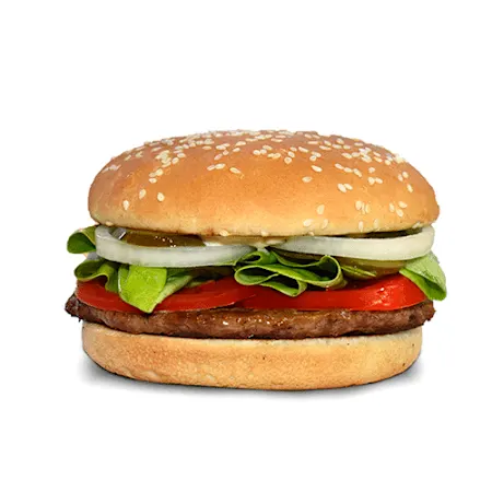 Een wit sesambroodje met rundvlees, verse uitjes, augurken, frisse ijsbergsla, verse tomaat en onze bekende ...
