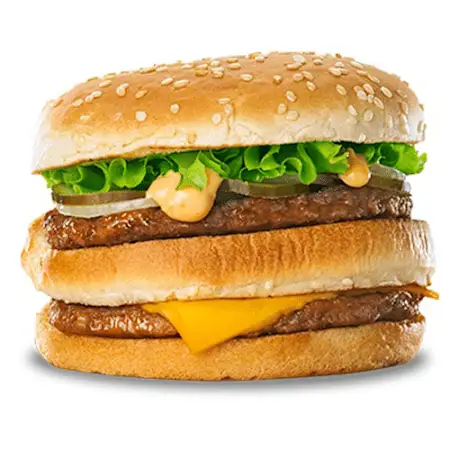 Een 3-delig sesambroodje met rundvlees, verse uitjes, augurken, frisse ijsbergsla, cheddar kaas en de bekende ...