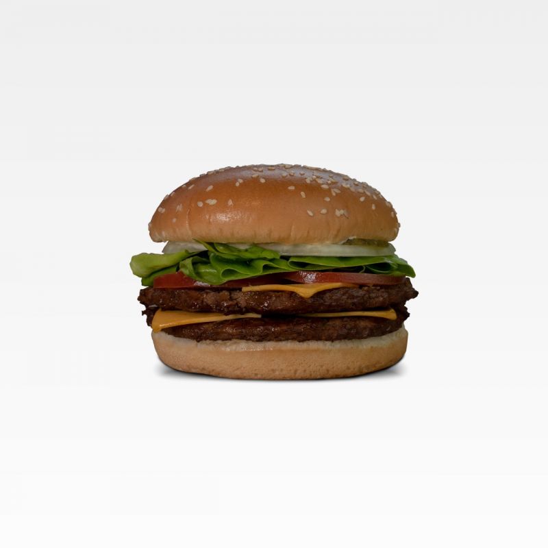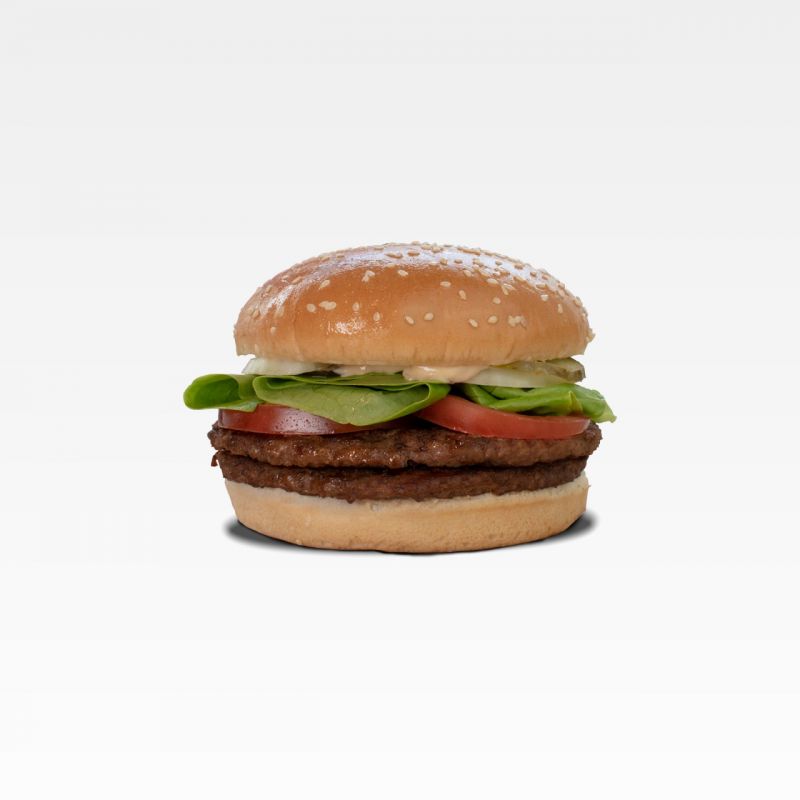 Een wit sesambroodje met double rundvlees, verse uitjes, augurken, frisse ijsbergsla, verse tomaat en onze ...