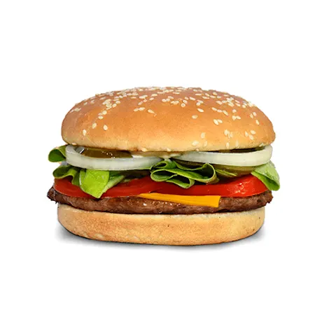 Rundvlees, verse uitjes, augurken, frisse ijsbergsla, verse tomaat, cheddar kaas en onze bekende burger dressing.