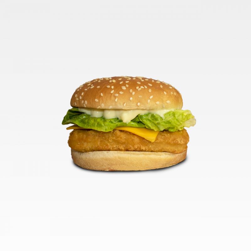 Een wit sesambroodje met knapperige kip, frisse ijsbergsla, cheddarkaas en mayonaise als burger dressing