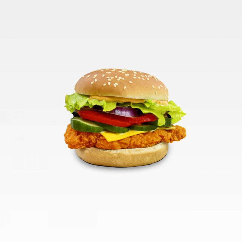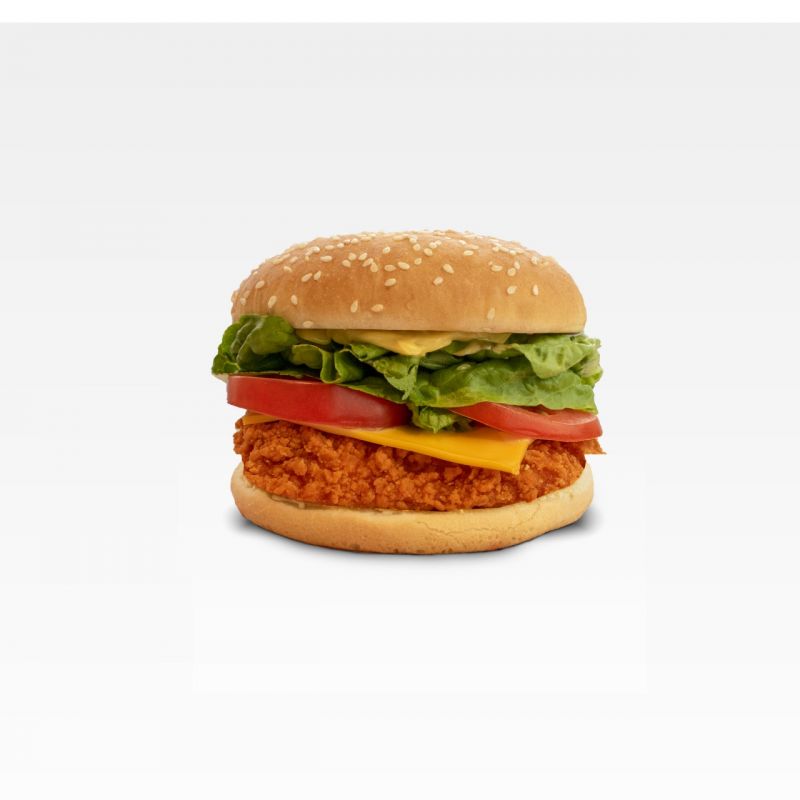 Een wit sesambroodje met een knapperige kipfilet, frisse ijsbergsla, verse tomaat, cheddar kaas en onze ...