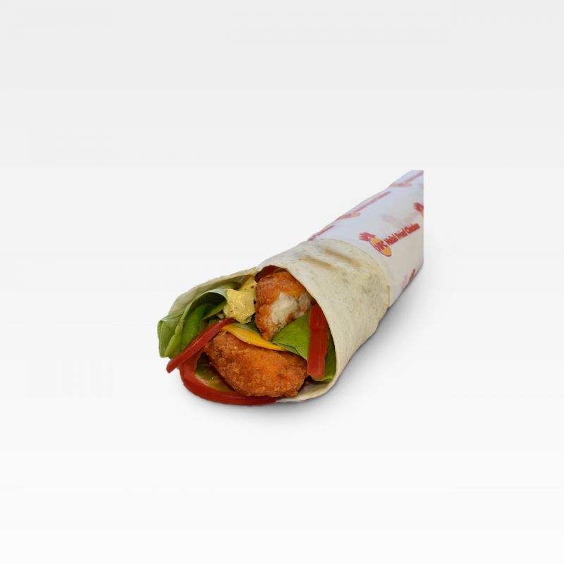 2 knapperige licht pikante chicken filet tenders, frisse ijsbergsla, cheddar kaas, verse tomaten blokjes en ...