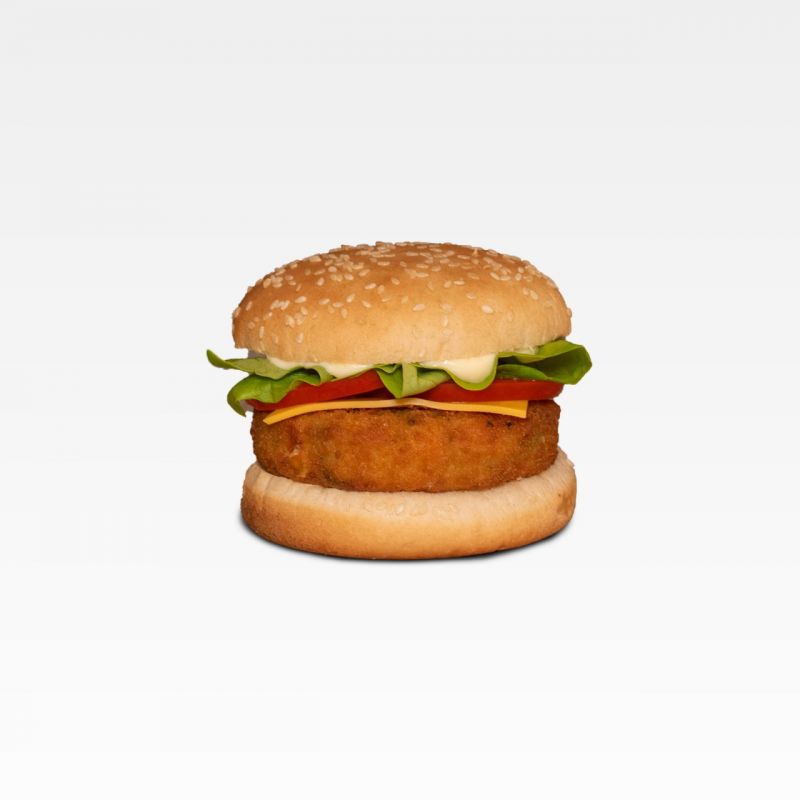 Een wit sesambroodje met frisse ijsbergsla, verse tomaat, cheddar kaas, een knapperige jasje met daarin ...