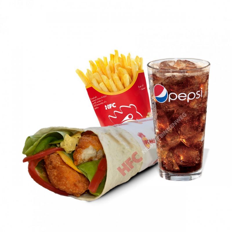 3 knapperige chicken filet tenders. Inclusief een portie Franse frietjes en een frisdrank naar keuze.