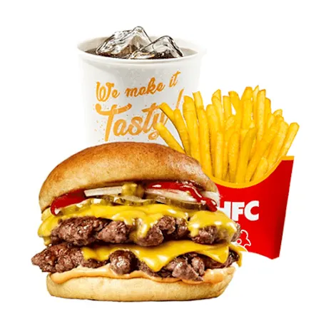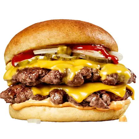 Een sappige dubbele smashburger met twee gegrilde beef patties, gesmolten kaas, frisse krop sla, ...
