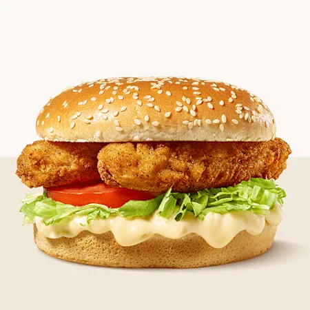 Een groot wit sesambroodje met 2 licht gekruide knapperige chicken tenders, frisse ijsbergsla, verse tomaat, ...